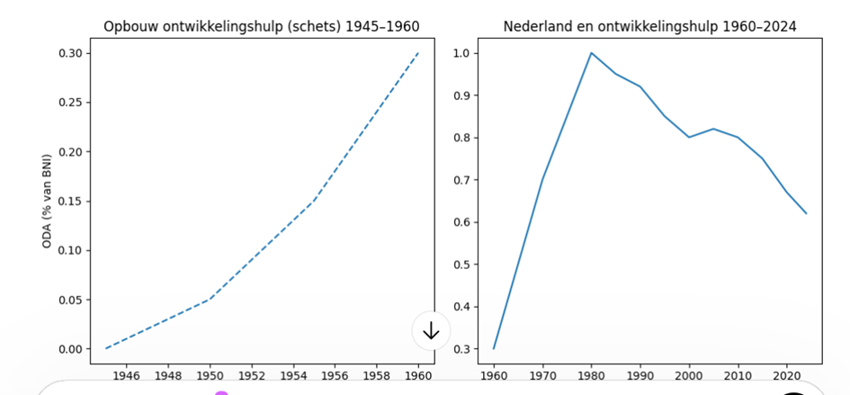 In die tijd kreeg ik aandacht voor ontwikkelingshulp. De armoede in de wereld bestrijden. Vanaf circa 1960 groeide de Nederlandse ontwikkelingshulp snel uit tot een structureel onderdeel van het beleid, gedragen door een combinatie van morele overtuiging, internationale verantwoordelijkheid en economische rationaliteit. In de jaren tachtig bereikte Nederland met circa 1% van het nationale inkomen een internationaal uitzonderlijk niveau, ruim boven de door de Verenigde Naties nagestreefde norm van 0,7%.[1]