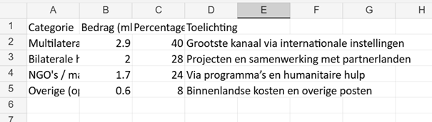De Nederlandse overheid gaf in2023 €7,2 miljard uit aan ontwikkelingssamenwerking, Dat is 0,7% van het BBP`. Daarvan gaat 24% via NGO”s omdat dit efficiënt is. Voor 2026–2030 wordt juist ongeveer €1 miljard bezuinigd op NGO-subsidies. Er is niet één homogeen “NGO-complex” per jaar, maar een verspreid subsidieveld over meerdere jaren en programma’s